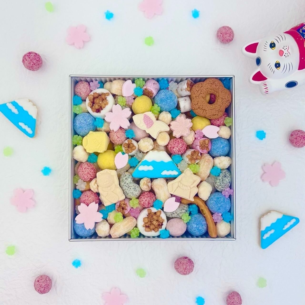 桜舞う中、アイシングクッキーの富士山を中心に和三盆の力士、金魚、招き猫などの伝統菓子たちが百花繚乱。