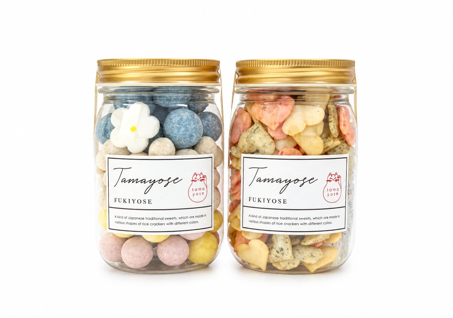 ハート型おかきを、醤油・青のり・えびの3つの味で楽しめるミニボトル。