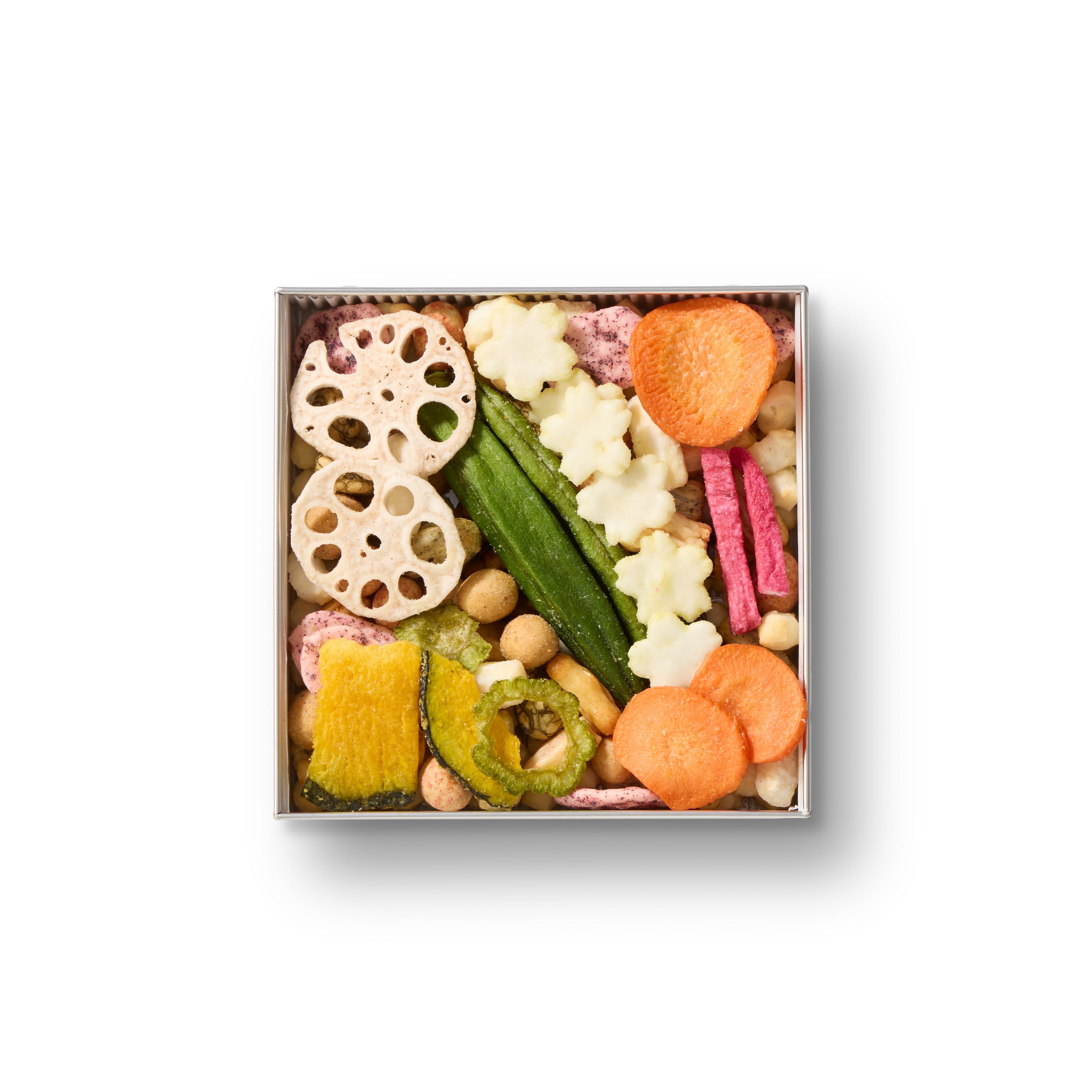 オクラやニンジン、赤だいこんなどの野菜チップスが色とりどりに映える、美味で美しい”しょっぱい缶”。